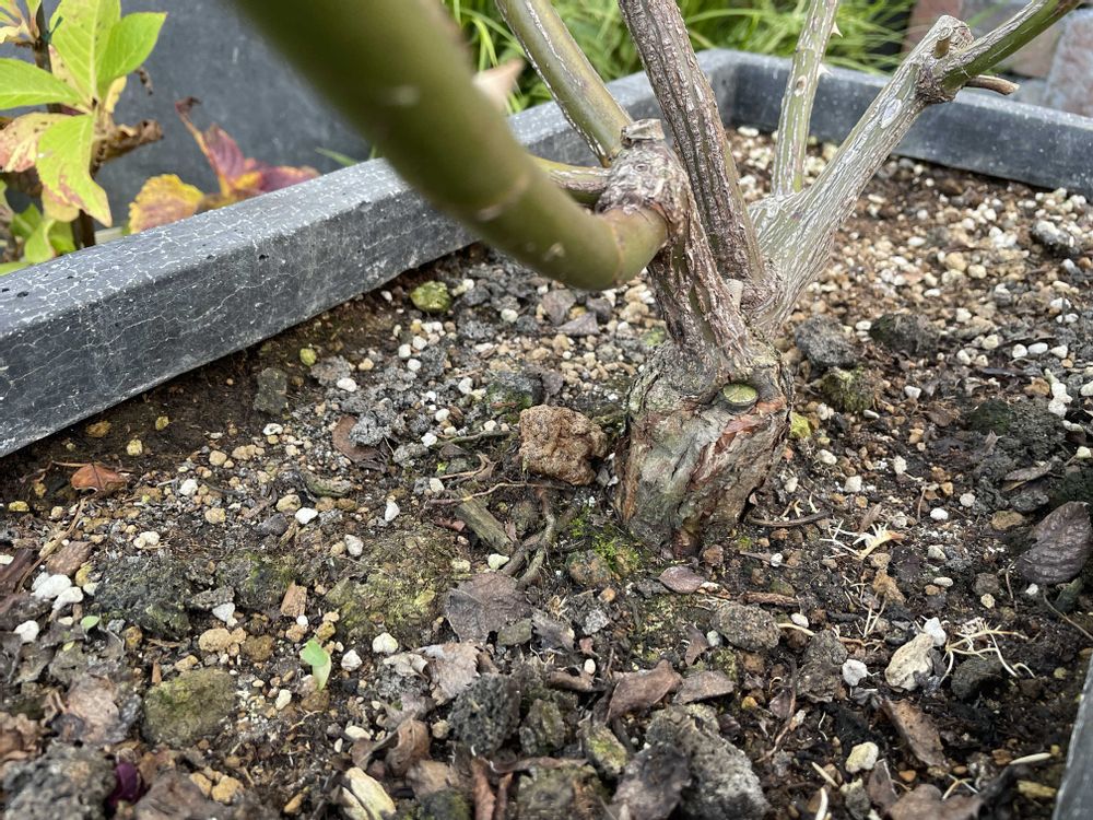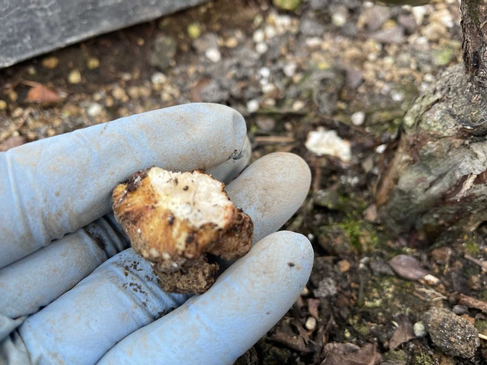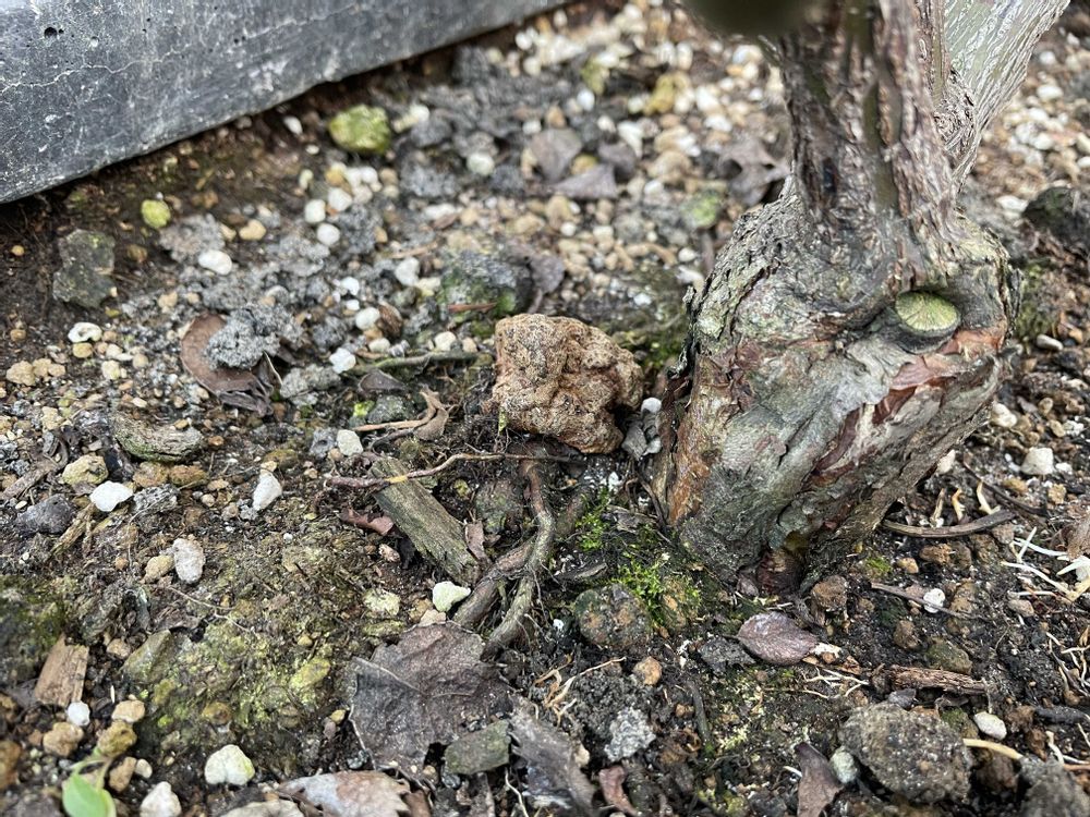 早く地植えしてあげようと穴掘って、鉢の上にたまった枯葉をどけていたら…