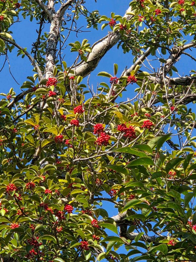 青空に伸び伸びと映える白い木肌に光沢の有る赤い実が美しかったです💖