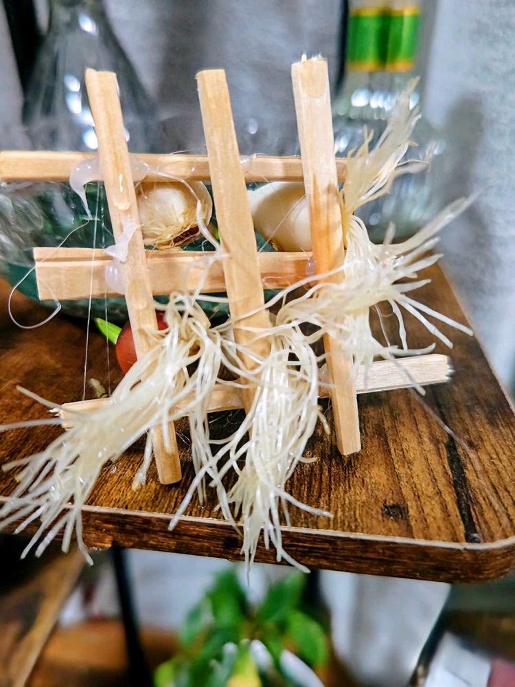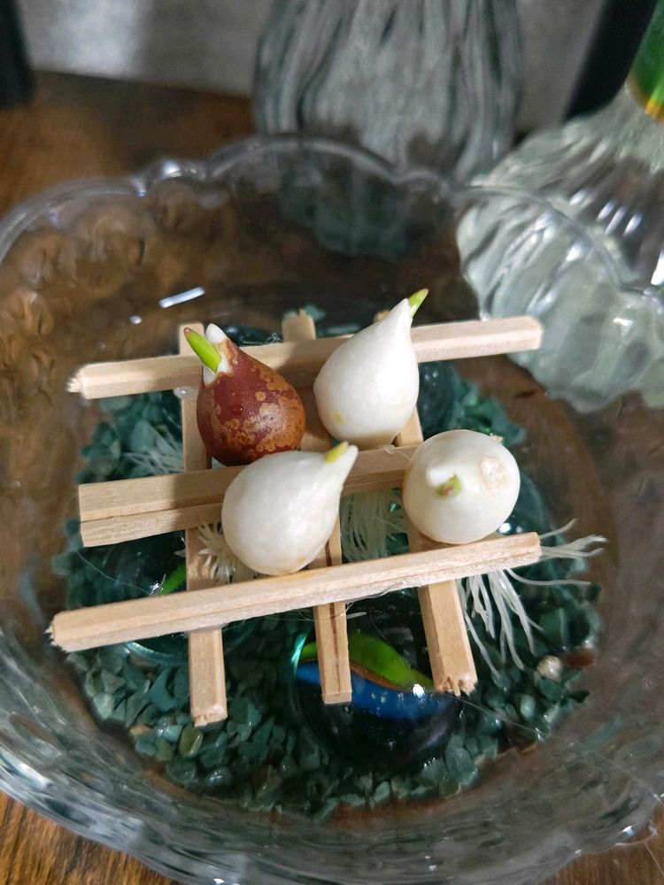 丸久さんのアイデア参考に、割り箸を井桁に組んで、その上に球根乗せました(4個)。