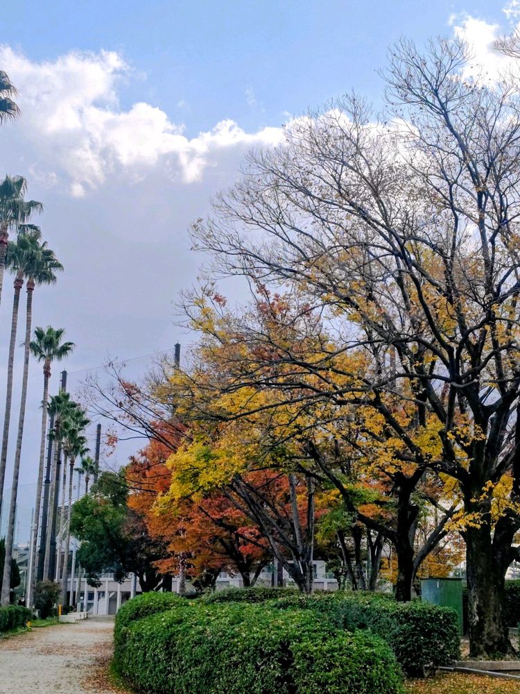 お世話する公園のケヤキや椰子の木🌴。ケヤキは黄葉になり半分以上風に舞ってます🍂。落ち葉掃きが大変な季節です。(2025/12/3)