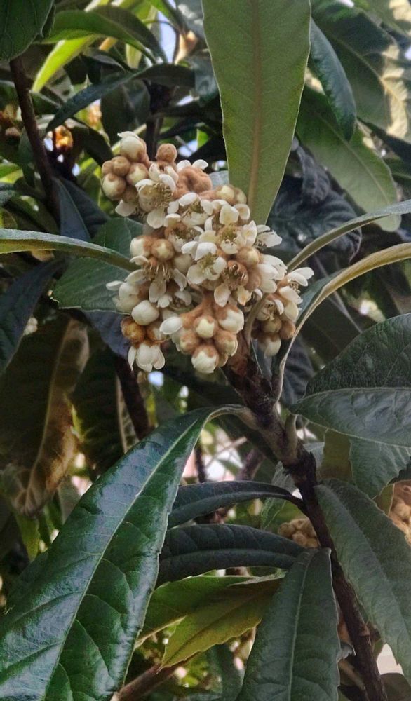 今日のお花は 目立たないクリーム色の花を咲かせる ビワ(枇杷)です。