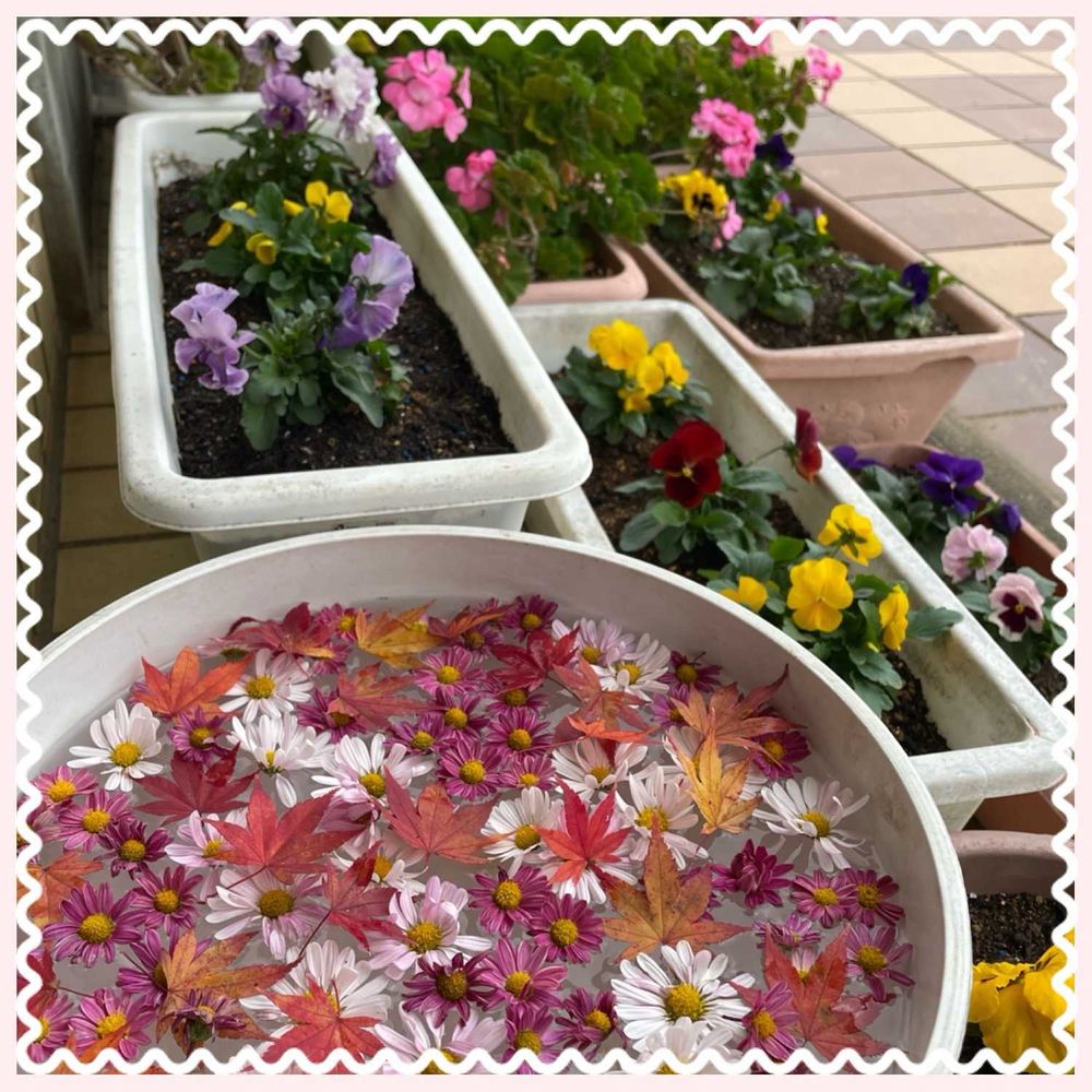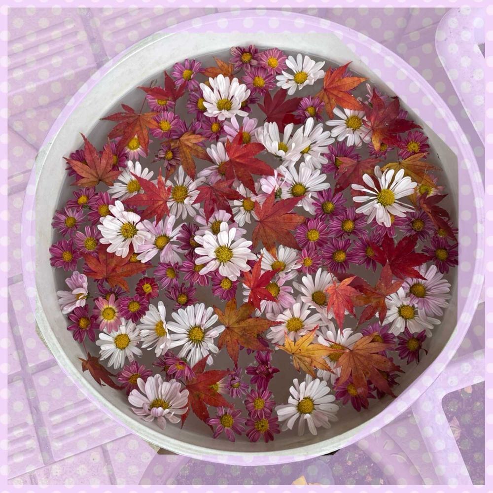 お菊さんはもう終わりかけで💦🍁がたくさん落ちていたのでキレイだなぁと見ていたら〜ふと花手水を思い出し浮かべてみました♬