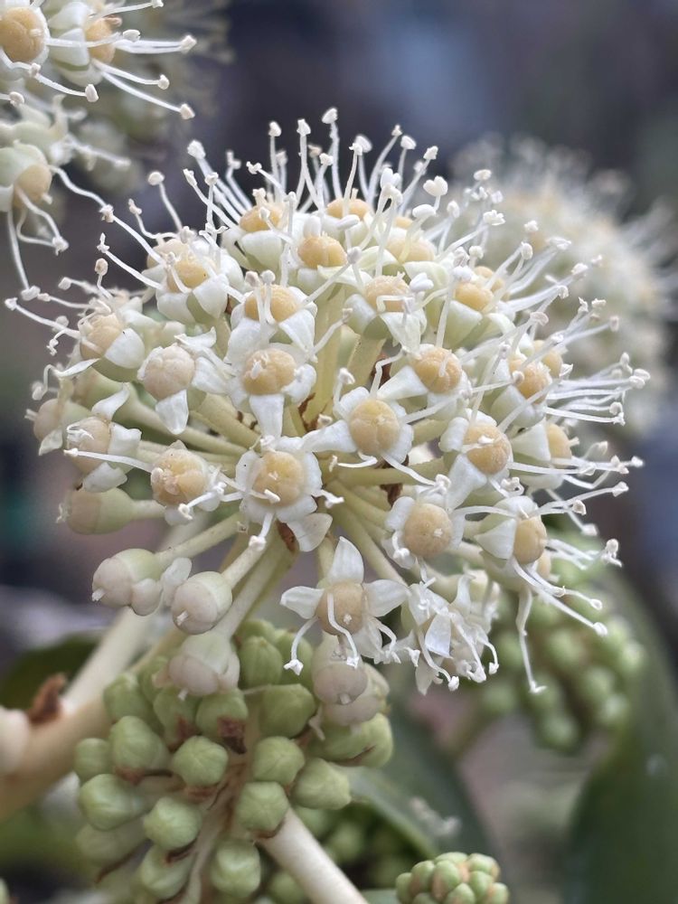 ヤツデも不思議な造形ですね。花の少ないこの時期、お隣さんに感謝です😄