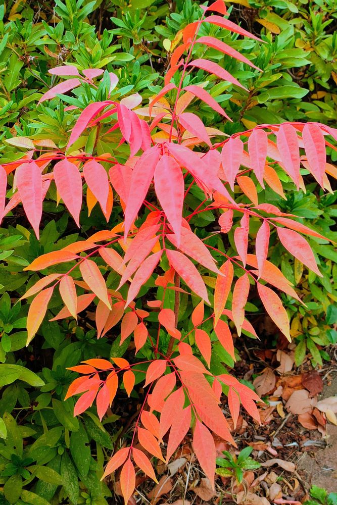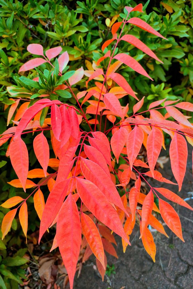 光を求め、サザンカの高い垣根を飛び抜けて紅葉しているハゼノキです。