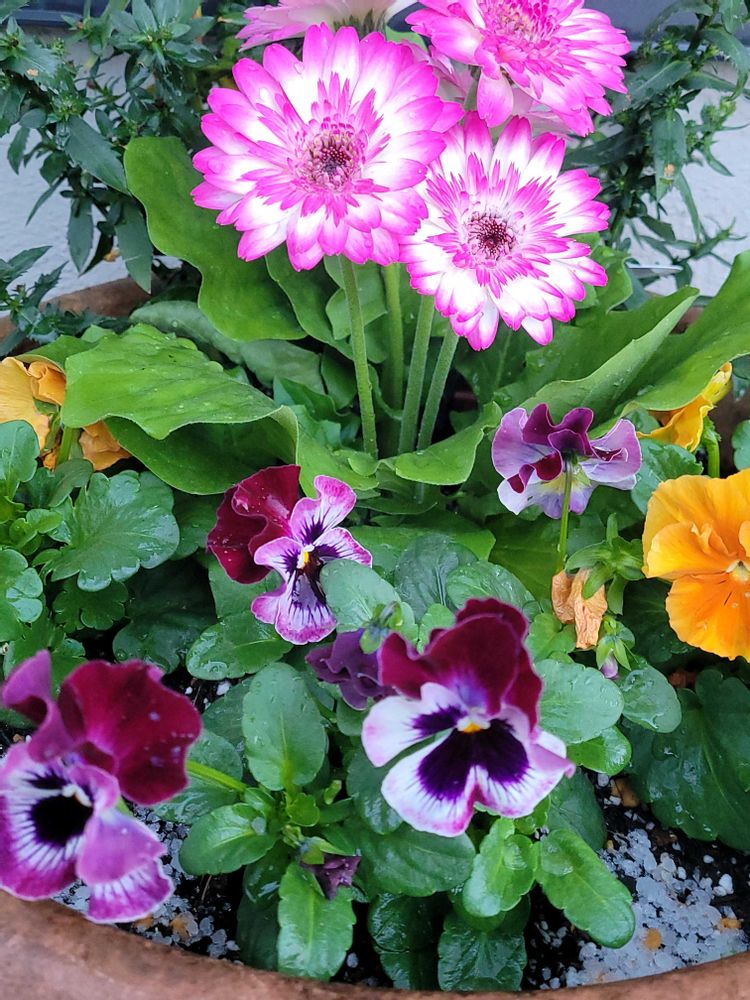 ①最近ビオラ達と寄せ植えしました🤭 ピンクのガーベラ可愛いでしょう🩷春まで頑張って欲しい