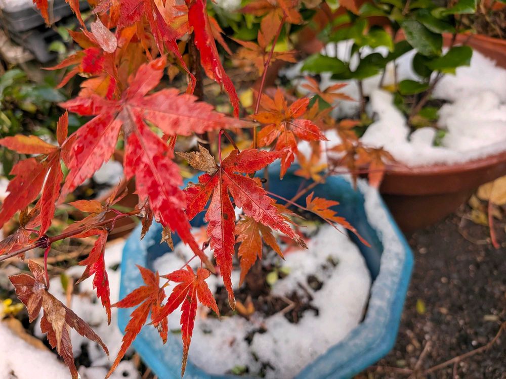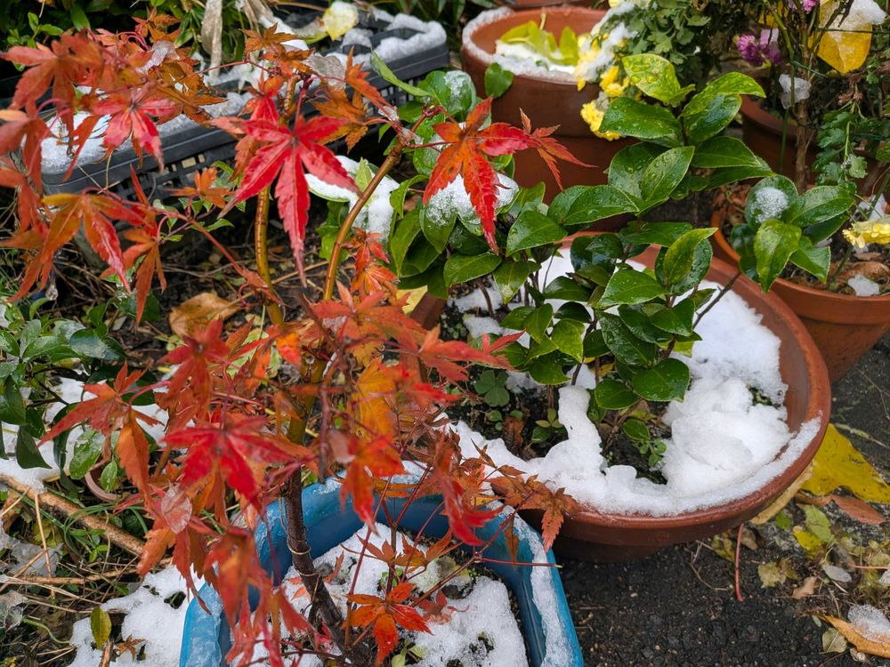 鉢植えの紅葉と花友さんに頂いた乙女椿の鉢植えに初雪が積もっています💚🍁❄️