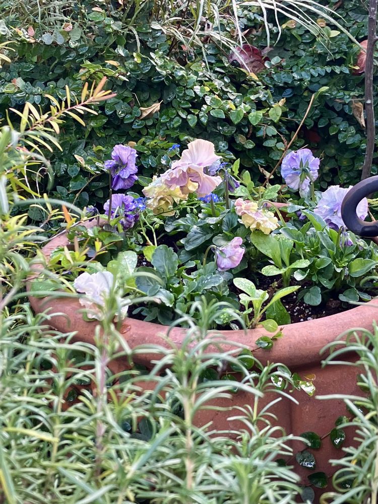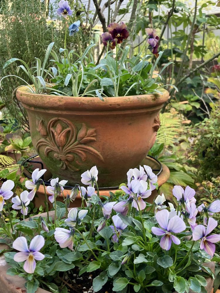 2枚目の写真、ビオラのシックな色と鉢の雰囲気がぴったり🤎🖤💚