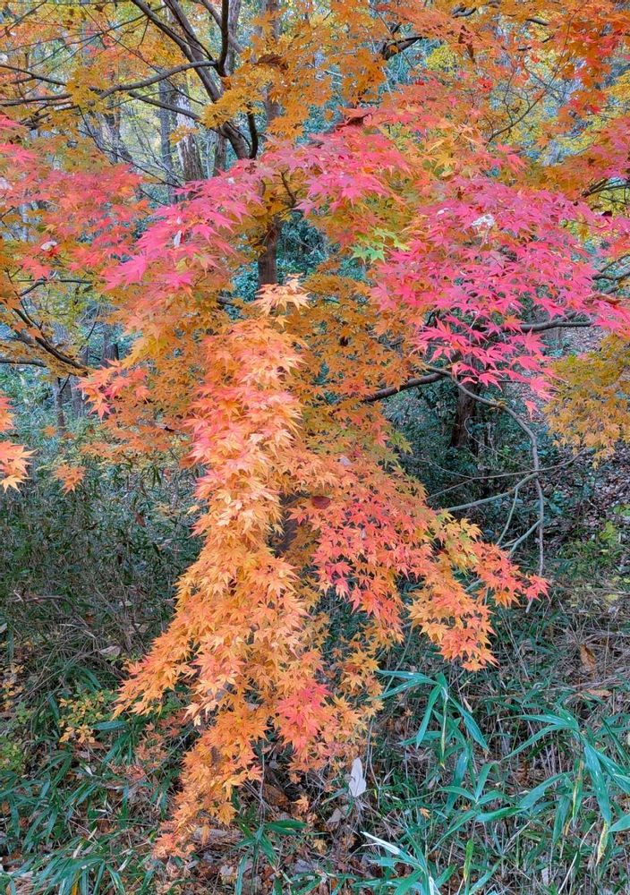 晩秋に晴れた日が何日も続いた後で急に冷え込むと紅葉は一気に進む。谷間は冷気がたまり、湿度が高く葉が新鮮に保たれるため特に紅葉の色も鮮やかになる。
