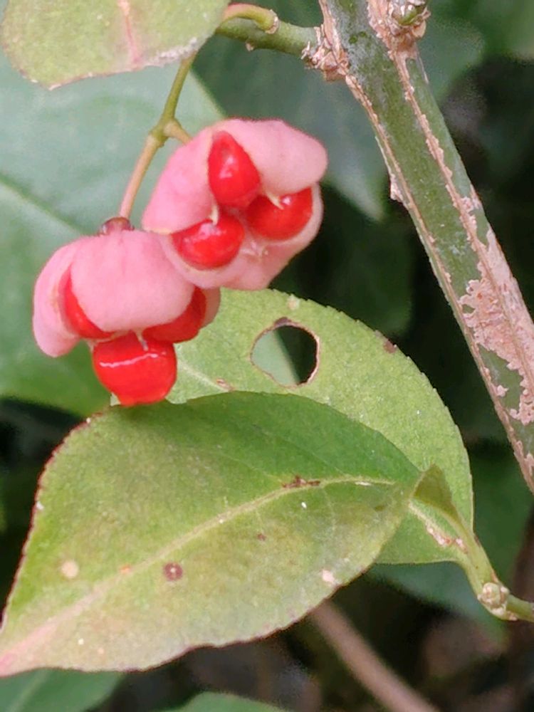 淡紅色の果実は熟すと4つに裂けて、中から赤い種子が現れる。