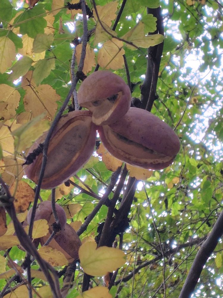 秋に熟すと、緑色から紫色または赤紫色に変化し、果皮が裂開して、中にゼリー状の果肉があり、甘くて食用になる。