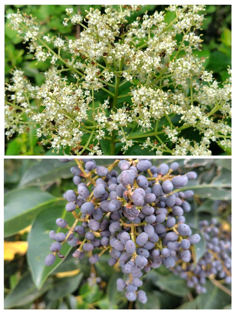 果実は12月頃、長さ7〜10mm、幅4〜6mmの卵状楕円形で黒紫色に熟す。