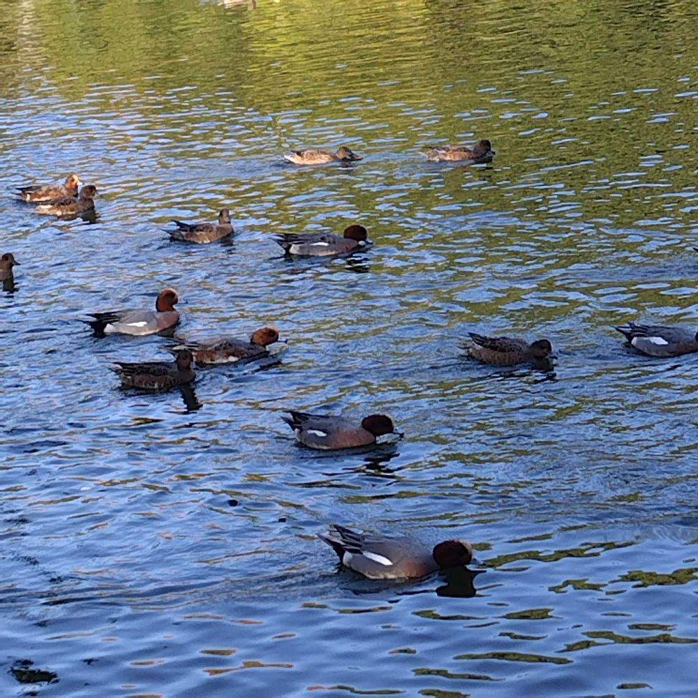 緑の影を映す池に沢山の鴨🦆🦆🦆🦆🦆