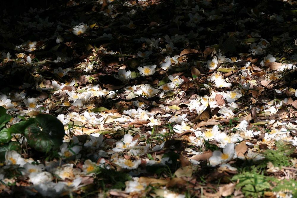 ツバキは花自体がそのまま落下する性質があるため、花多落ちる時期の地面には、目玉焼きがたくさん落ちている。