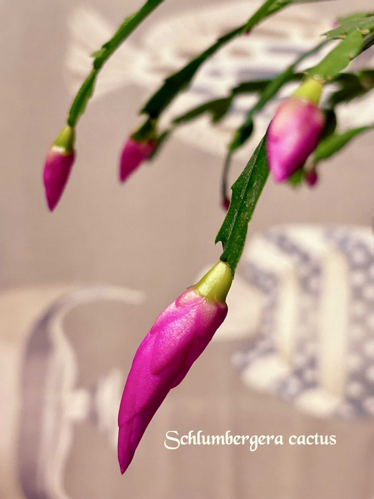 ベランダに置いていたシャコバさんは蕾の色がついたら🩷リビング窓辺に移動して開花を待っています…今年の成長は昨年より一週間は遅れていますよ!違いを観察するのも楽しいですね🥰今朝、少し開いてきましたョ💓