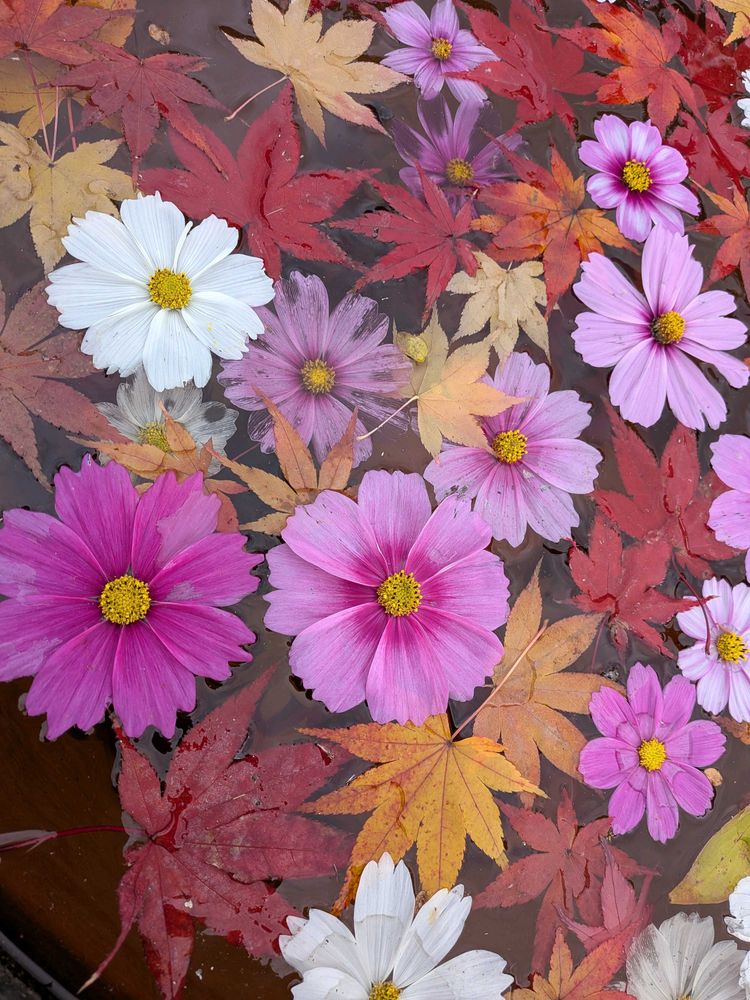 花の水盤の中にたくさんのコスモスと紅葉がとても素敵でした〜✨🥰