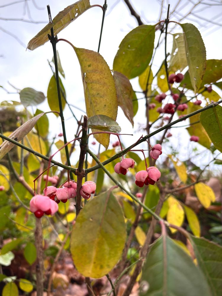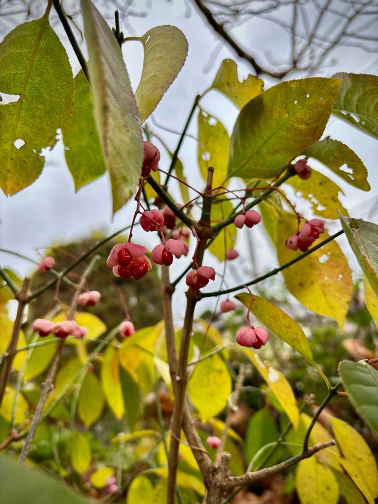 庭の黄木蓮の大きな葉(なぜだか最大30cm)もすっかり葉を落とし、下にいたマユミが可愛い実を魅せてます(๑♡∀♡๑)