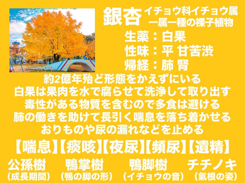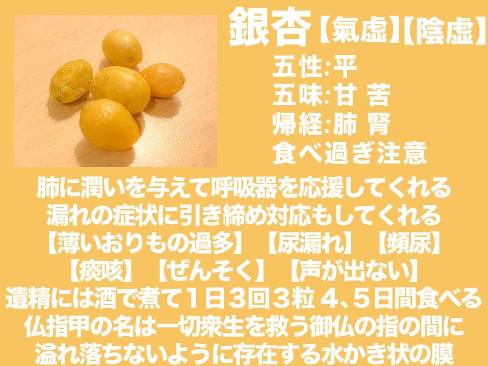銀杏さんは肺を潤して咳や痰のメンテナンスをしてくれたり下半身の“漏れ出る”症状の対処に働いてくださるみたいだよ