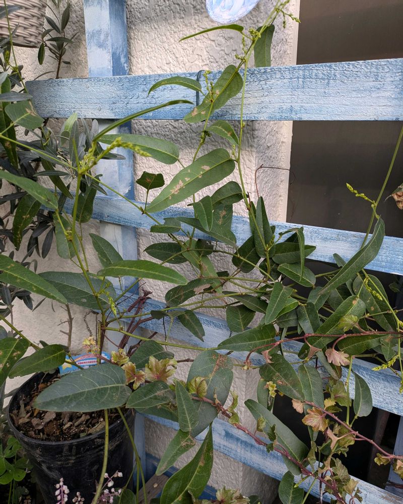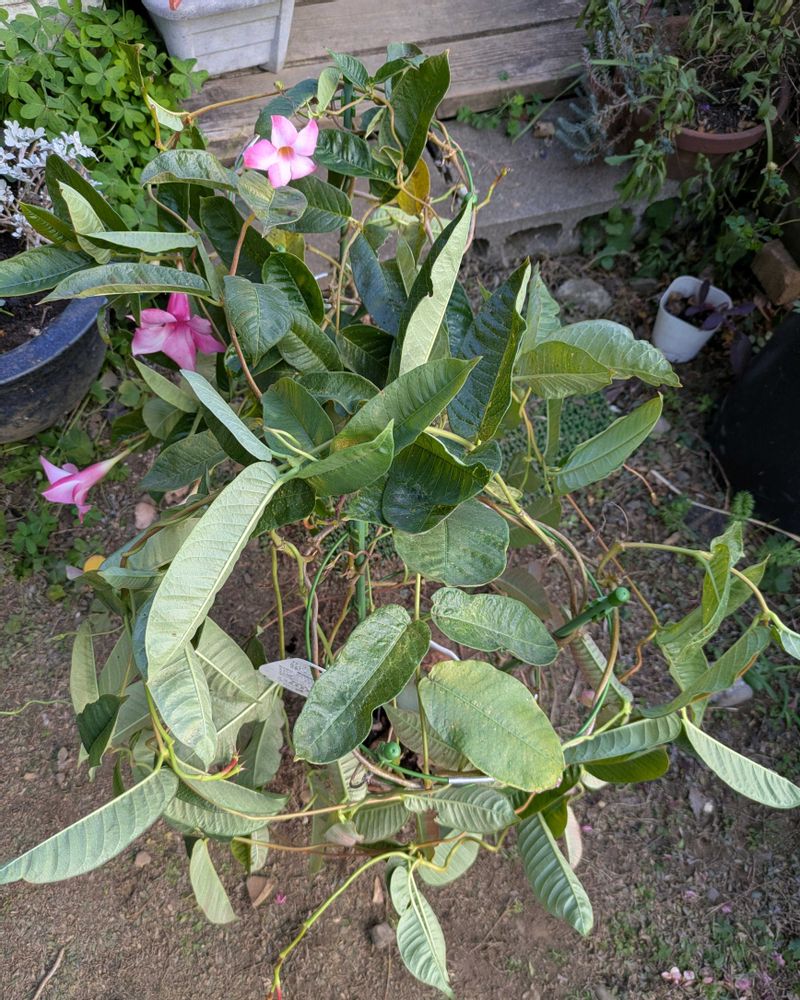玄関先の、マンデビラを、片付けて、ハーデンベルギアを、絡ませてみました。
