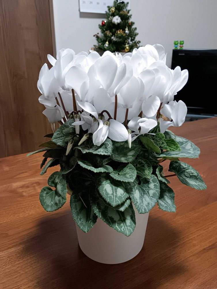 真っ白なシクラメン、お迎えしました。底面給水鉢に入ってました。底面給水鉢は初めてです。そのまま飾れて、植え替えしなくてもよいので楽ですね。長く咲いてくれますように😊