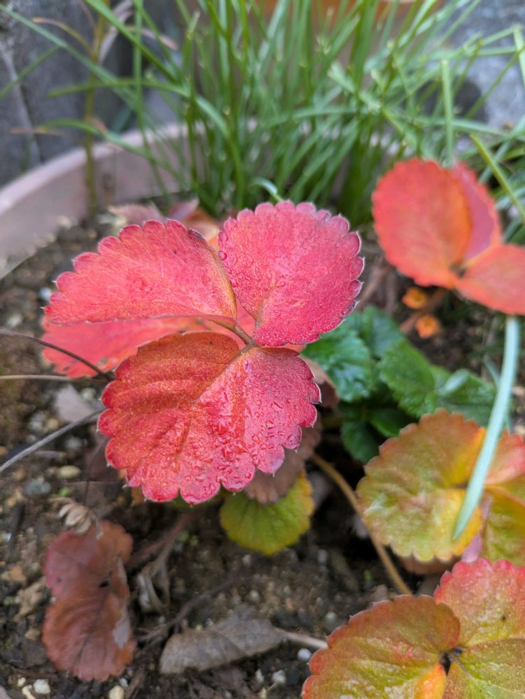 急に寒くなって、イチゴの葉もきれいに紅葉🍁