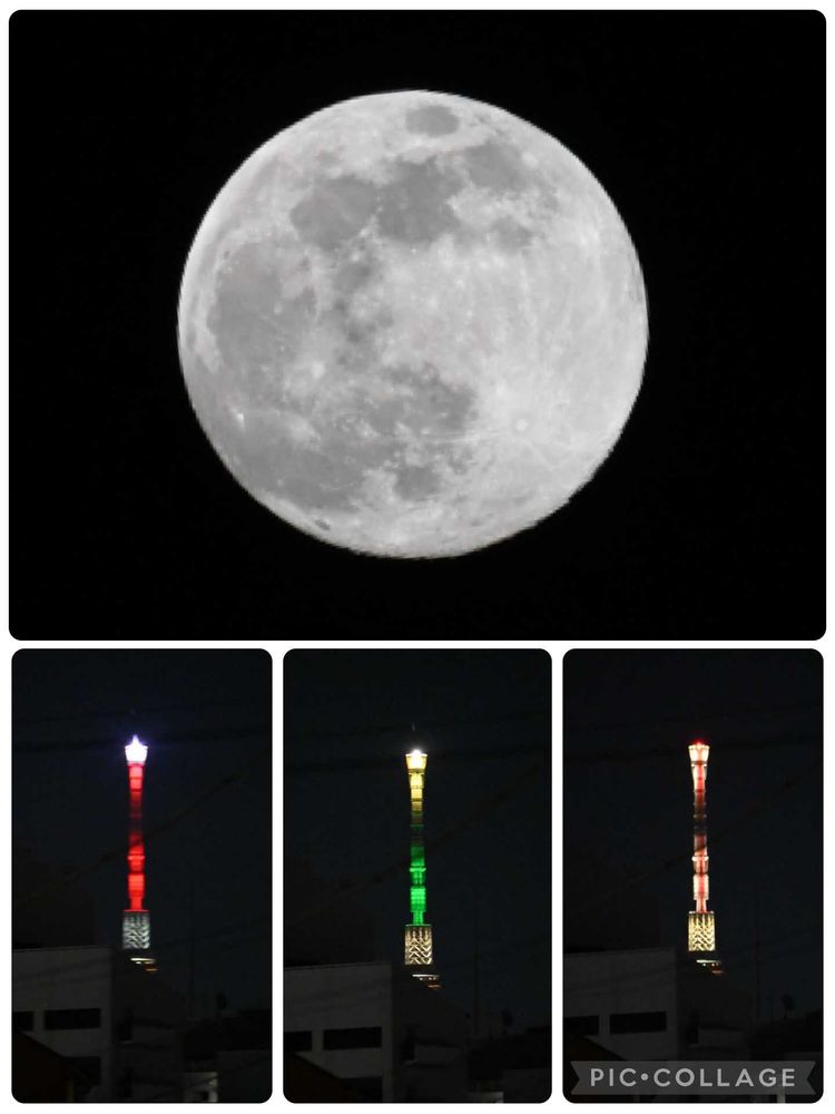 スカイツリー、肉眼ではちょっとしか見えないのだけど、月を撮ろうと思ってズームしたら、スカイツリーも大きく見えて、嬉しくてコラージュしちゃいました💕