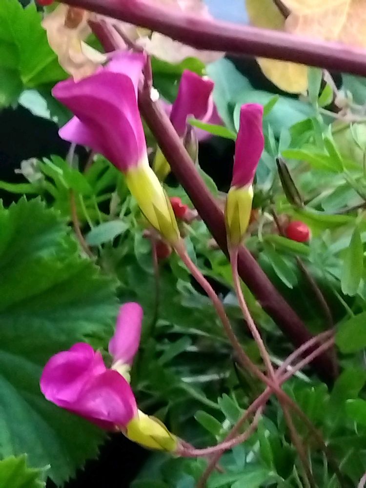大鉢にこぼれ種がたくさんのオキザリスの花を咲かせ