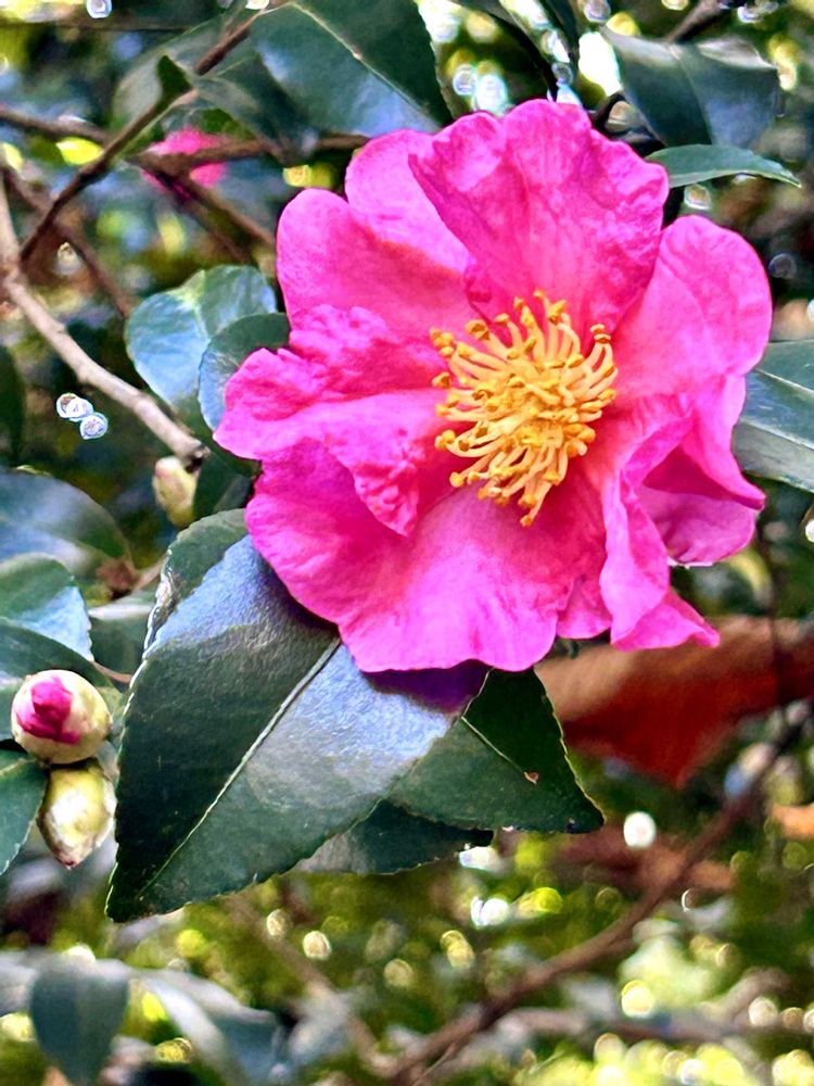 散歩公園の紅葉も終わりに近づき、冬の花サザンカとシシガシラが咲き始めました🤗サザンカは一般的なサザンカより少し地味な一重でこの木だけです😉一般的なピンクのサザンカはまだ遅れています😅三、四枚目は昨夜のゴールドムーン綺麗でした🌕🌿💕🌿