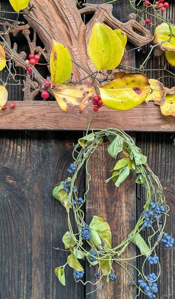 アオツヅラフジのツルを丸めて飾る💙葉も実も、水分が補給されないとすぐに萎れてしまうけれど、しばらくはフレッシュリースを楽しむことにする🔵