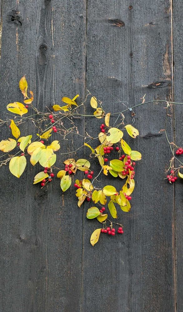 その欄間にサルトリイバラを絡めて、さらに余った枝を、黒い板塀に飾ってみた🟥