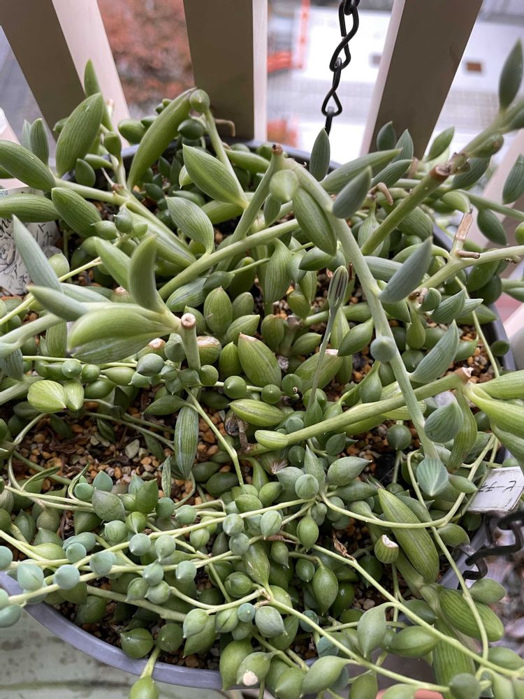 吊り鉢に実家の多肉花壇からカットして来たアーモンドネックレスを植えていましたがスカスカして寂しかったので隙間にピーチネックレスも挿しておいたらモリモリになりました♬