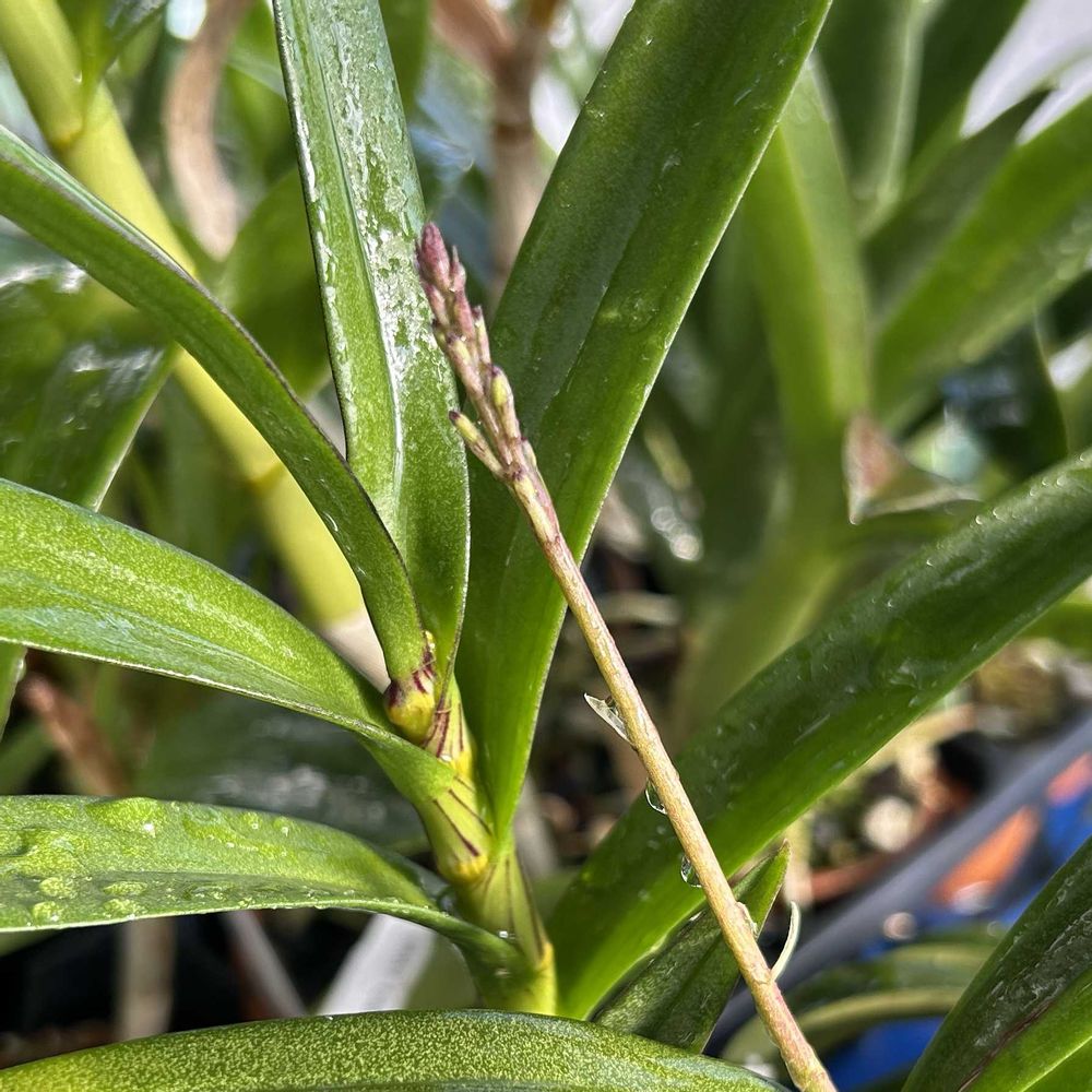 Dendrobium Blue Twinkle `Blue Hawaii'の花芽らしきものが伸びてきました🌱 咲かせたことがないので花芽かどうかもわからない🧐 2年間育てて初なので緊張します🫨 クルクルのキツネのような花は咲くのでしょうか🌸🦊
