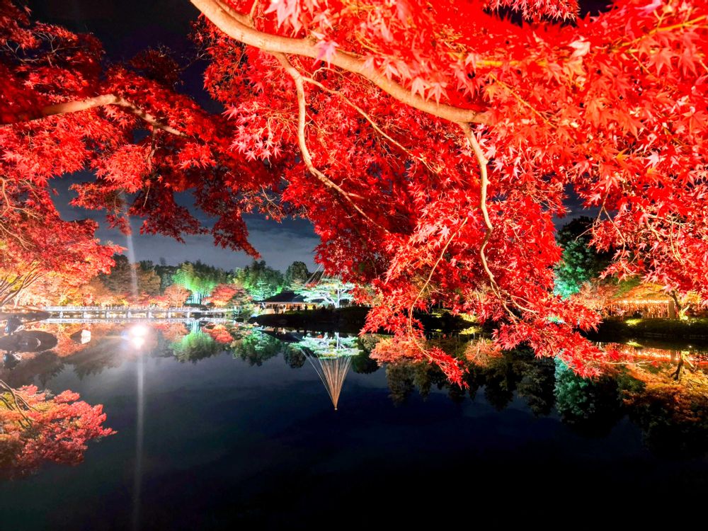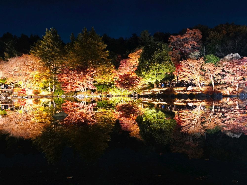 秋の夜散歩2025のメインでもある日本庭園のライトアップの写真です✨