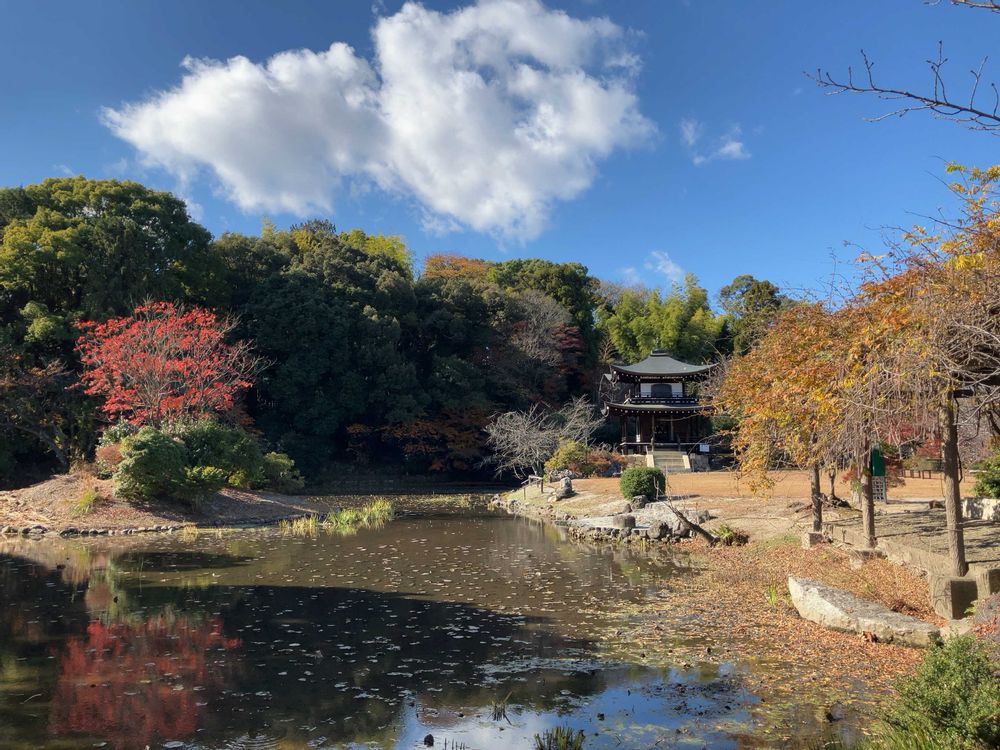 青空で氷室池の紅葉や大斐閣が映えてます✨