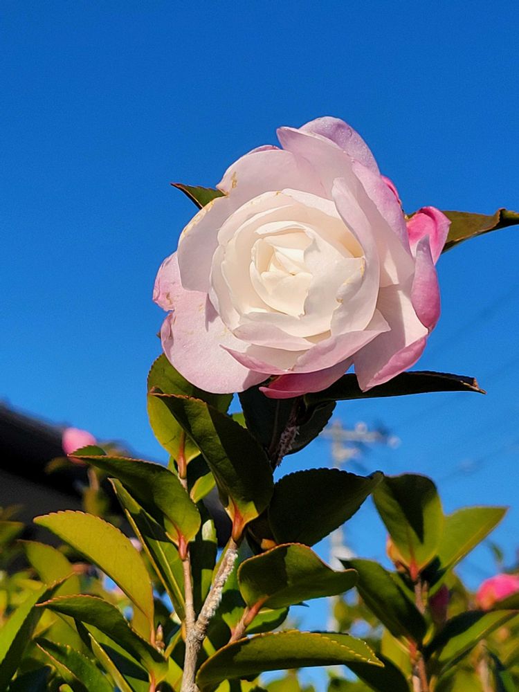 ④ご近所の山茶花が1輪、青空をバックに美しく咲いていました。