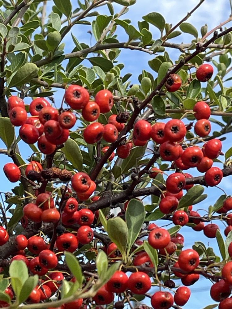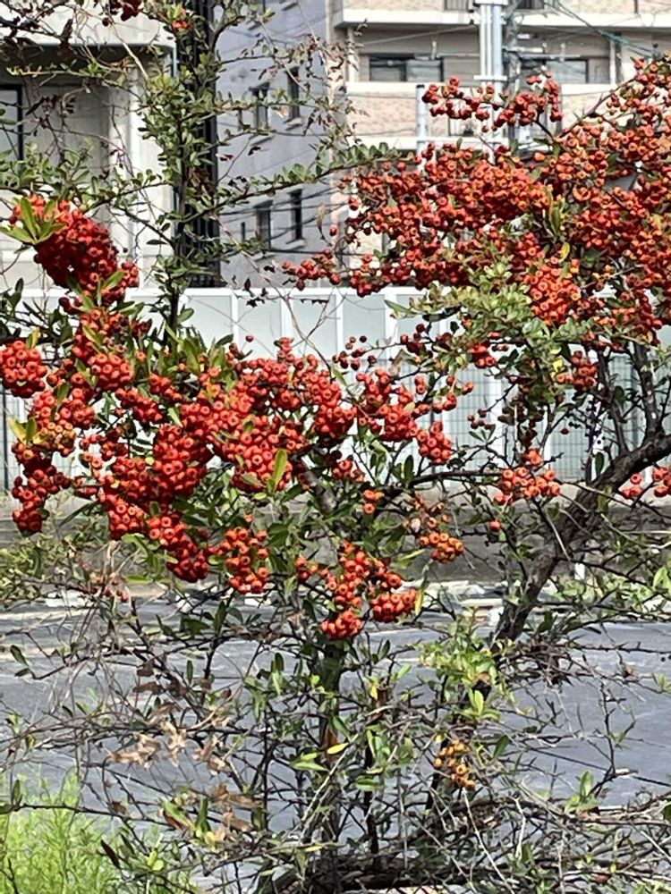 空き地でピラカンサの実が真っ赤に色づいて綺麗です🔴🌿.∘