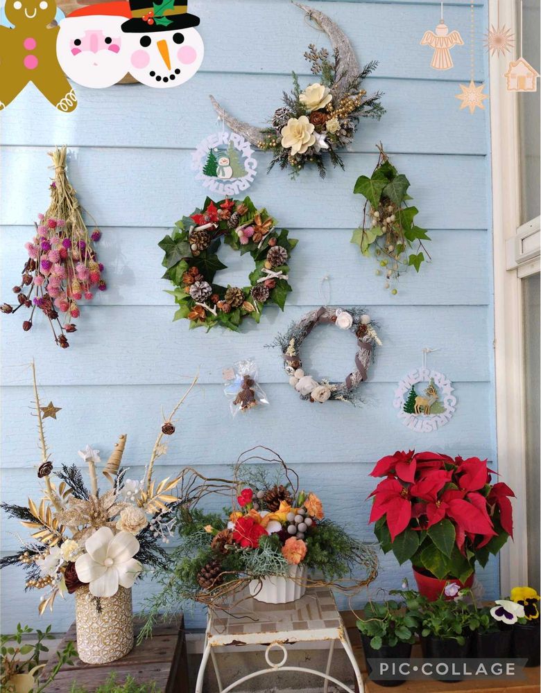 昨日作ったアレンジメントとリースも含めて、クリスマス関連のものを玄関前に並べてみました🎄⛄❤️💚🍂✨🎀