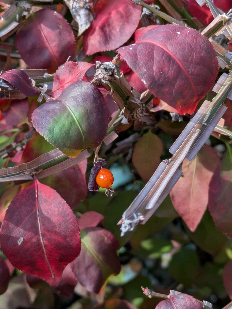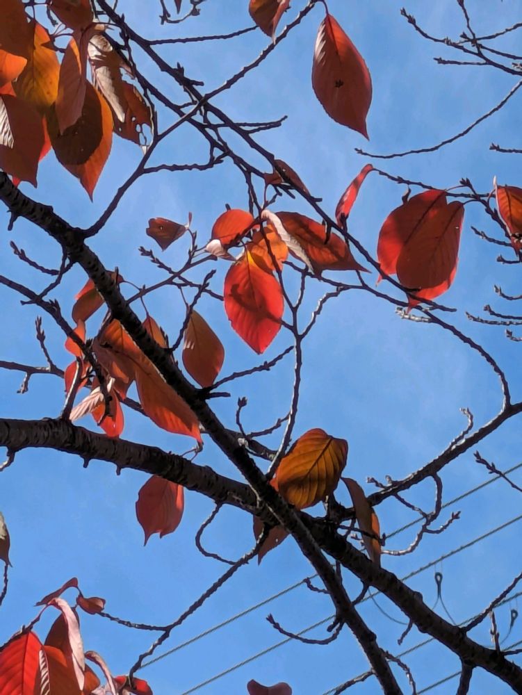 残りの紅葉、2週前の写真。今ではイチョウの葉は歩道を埋め尽くし、脇の店は掃除が大変。