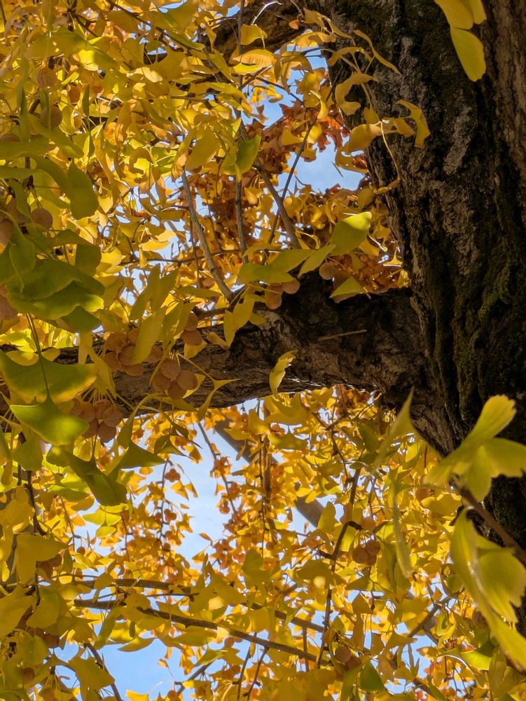 ②イチョウ科 イチョウ属 街路樹です。沢山の木はちょんちょんに切られているのに、この木はフサフサ。銀杏も生っています。