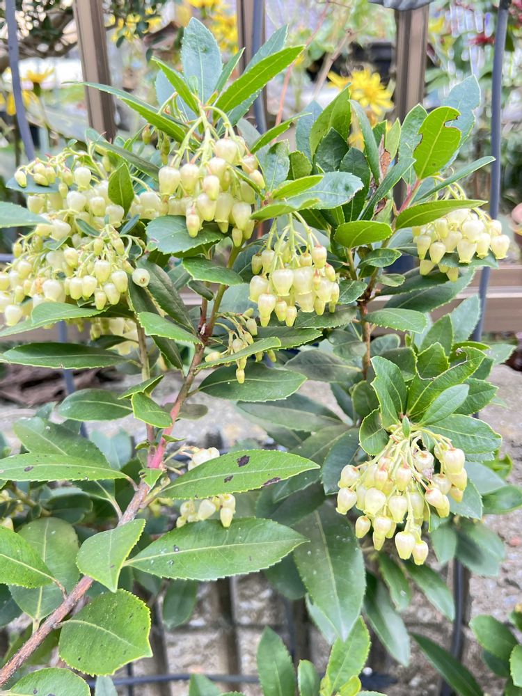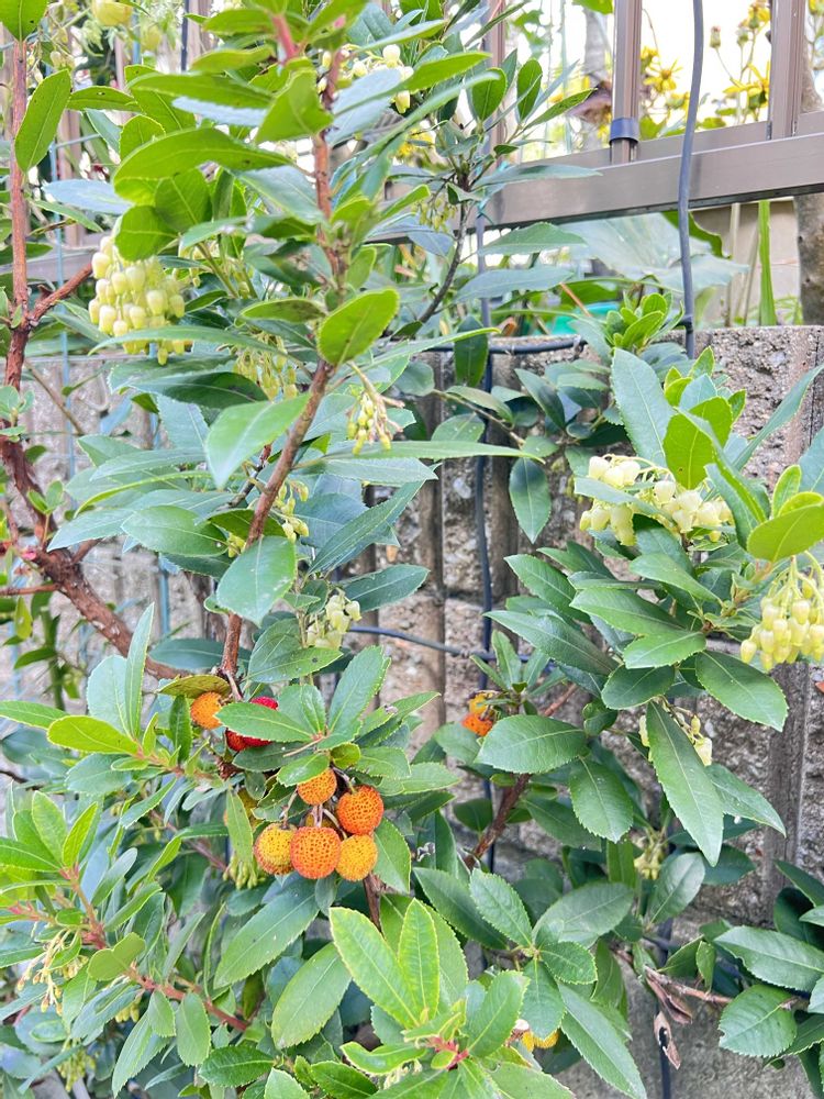 妹の家の庭で、苺の木の花と実が同時に見えて