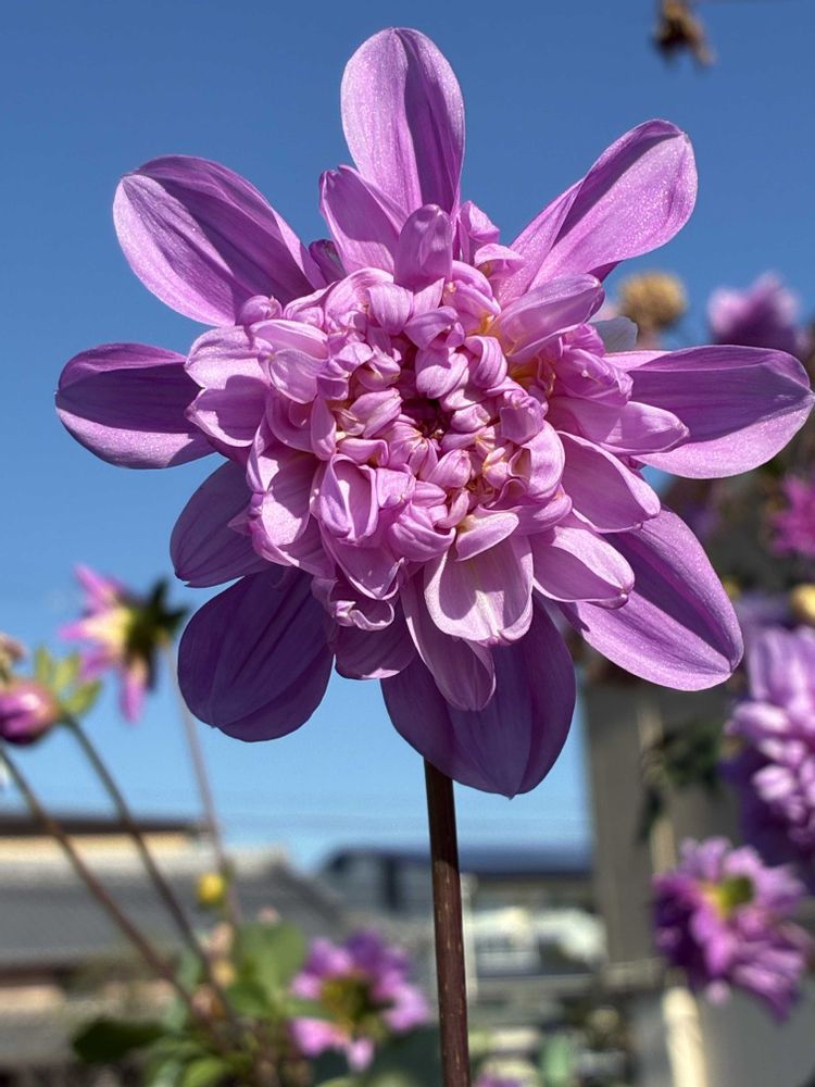 青空の下、紫色の「皇帝ダリア」が映えます。📸💙💜🌿🤗😄🌞✌️