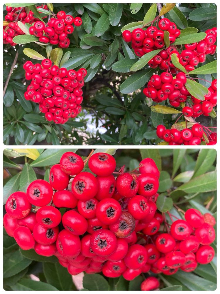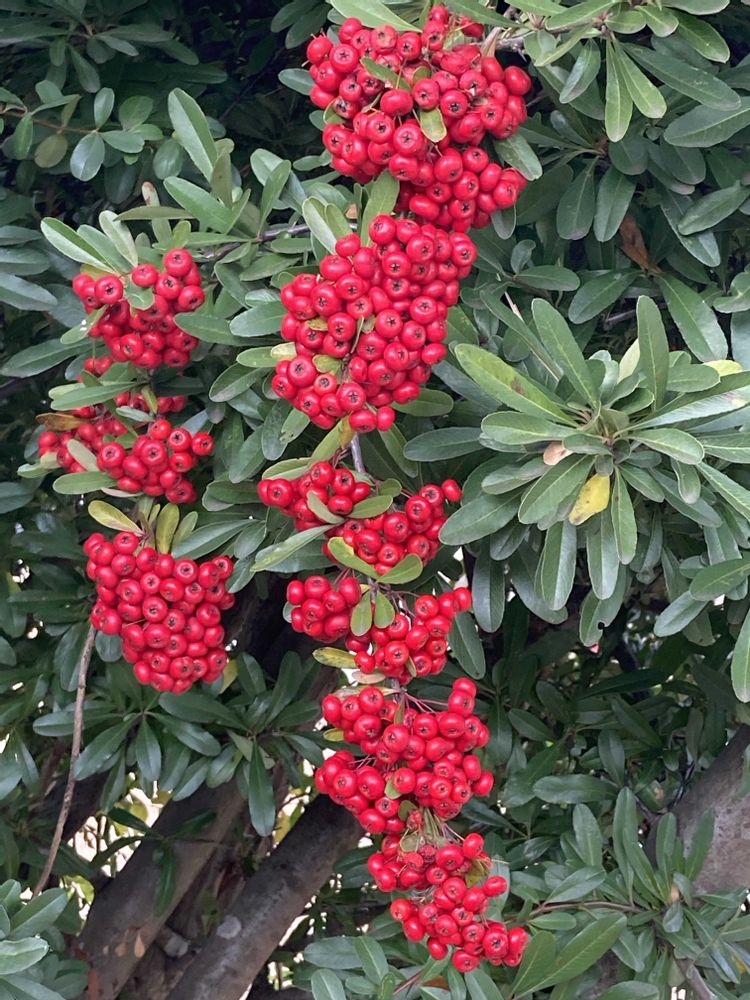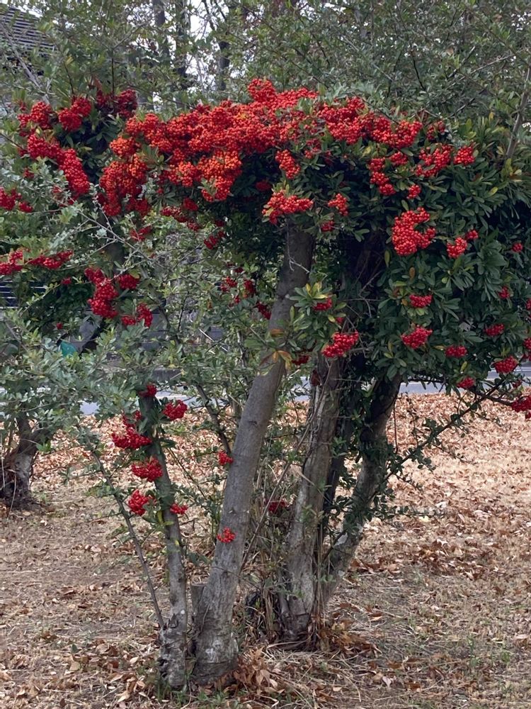 公園で見たピラカンサはオレンジ色の実を付けていたが、けやき通りの中央分離帯のは真っ赤な実をたくさん付けていた。