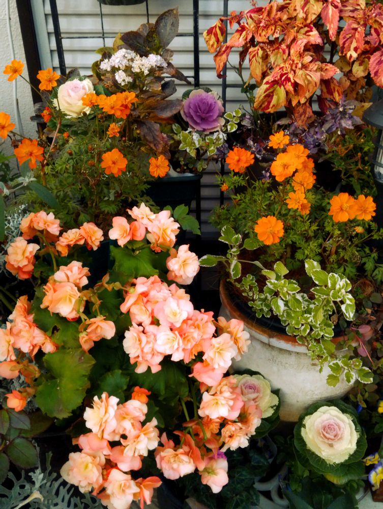 エラチオールベゴニアと黄花コスモス、栄養系コリウスの共演🌿