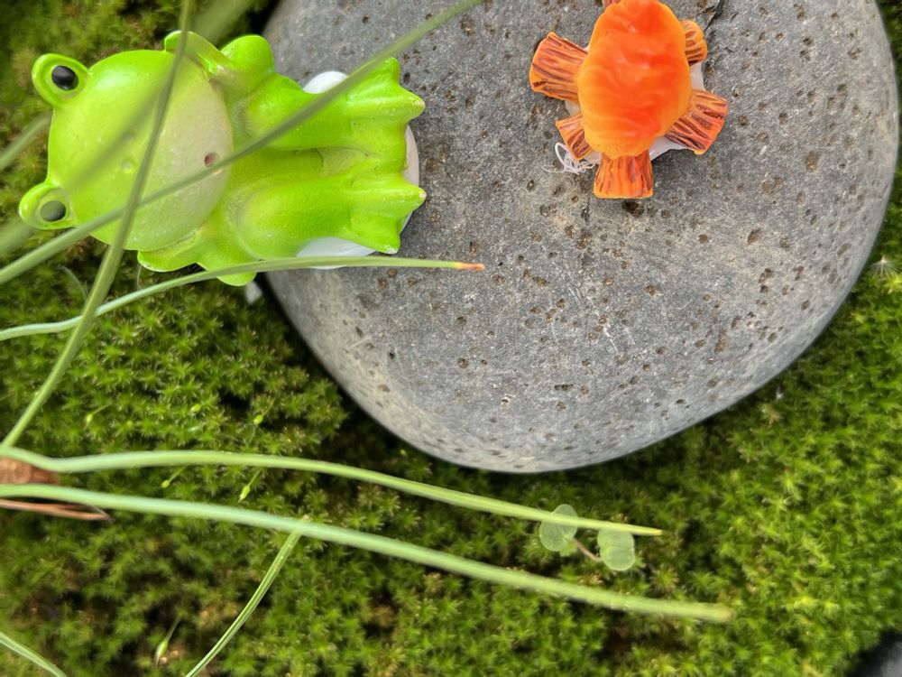 石の上で考えごとをしているカエルさん。石の周りは水に見立てたコケです。