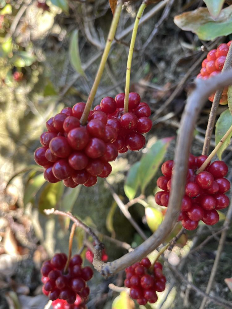 ➁ 真っ赤なサネカズラが石垣いっぱいに咲き誇っていました。