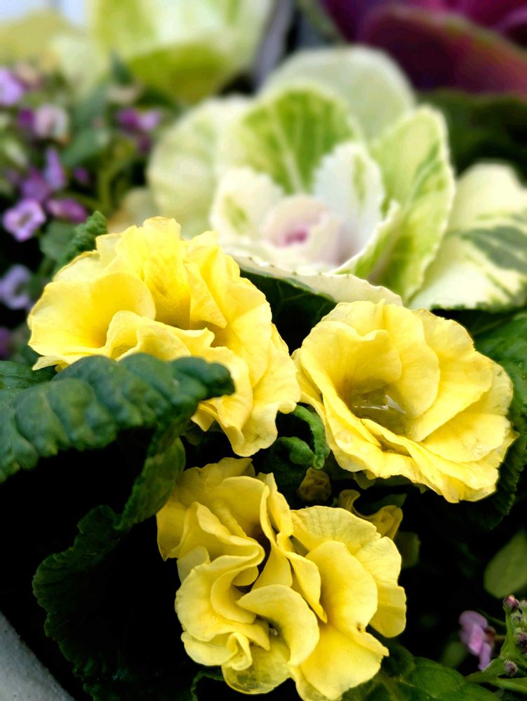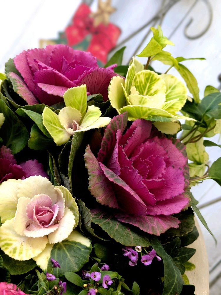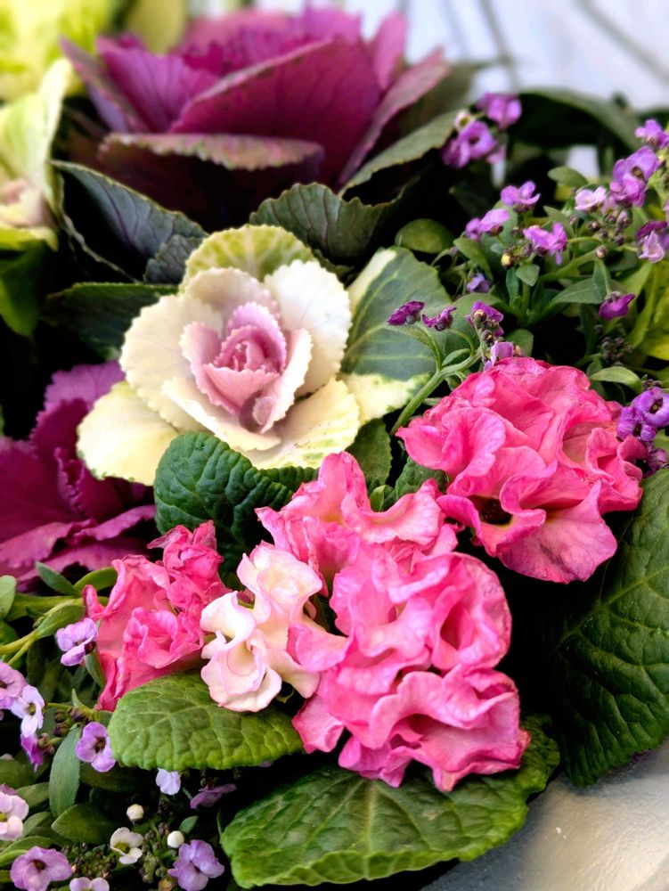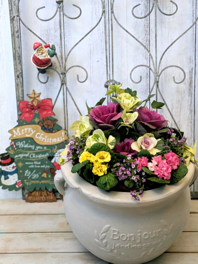 ジュリアンの明るさと可愛ぃ〜らしさが葉牡丹の寄せ植えを華やかにしてくれました✨