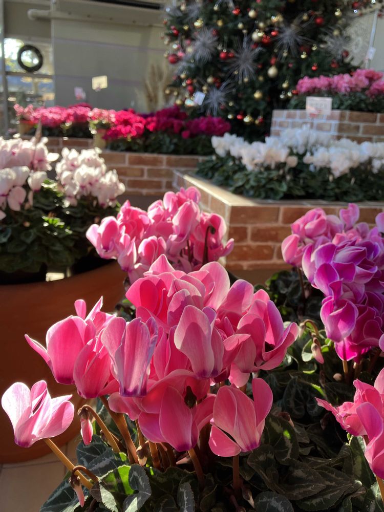 たくさんの種類のシクラメンが展示されていてクリスマスツリー🎄とのしつらえにうっとり