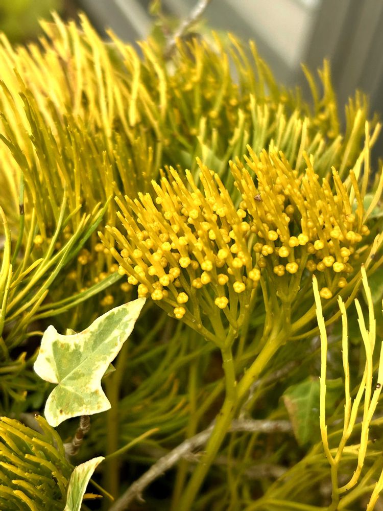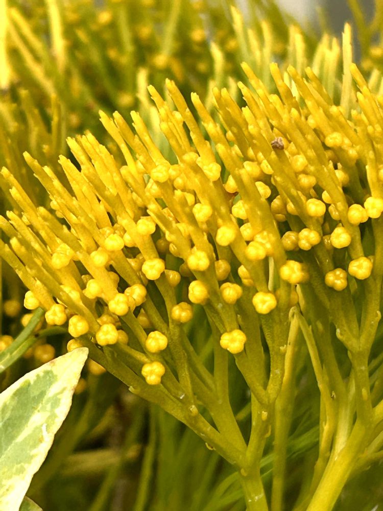 枝の先端の外側にアワの様な3つに分かれた胞子嚢を付け熟すと胞子を放出します