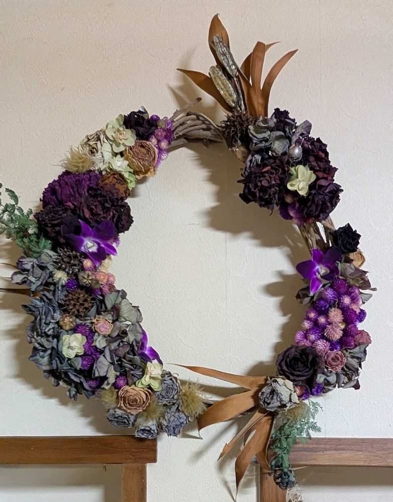 ドライフラワーも作ってはそのまま、、ようやくリースになりました。