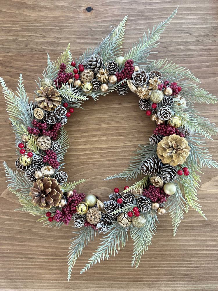 手作りリース、とっても素敵に仕上がりましたね🩷大人クリスマスの雰囲気がいいですね。