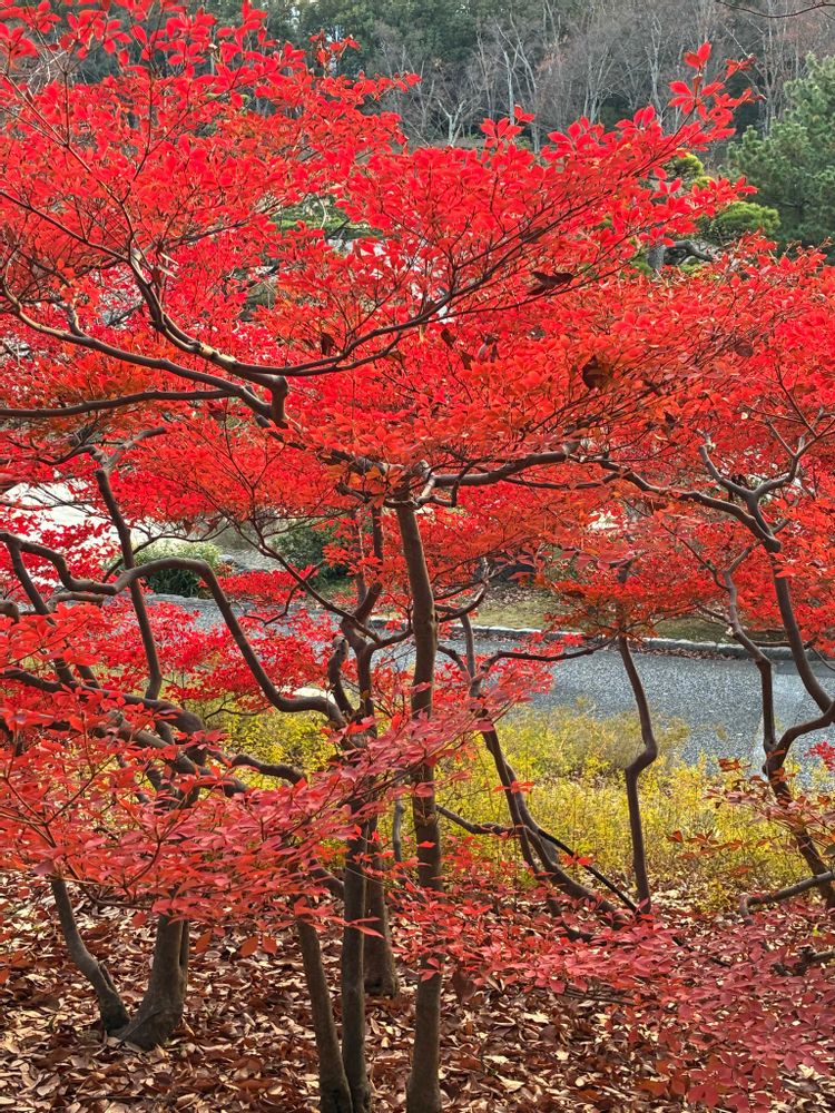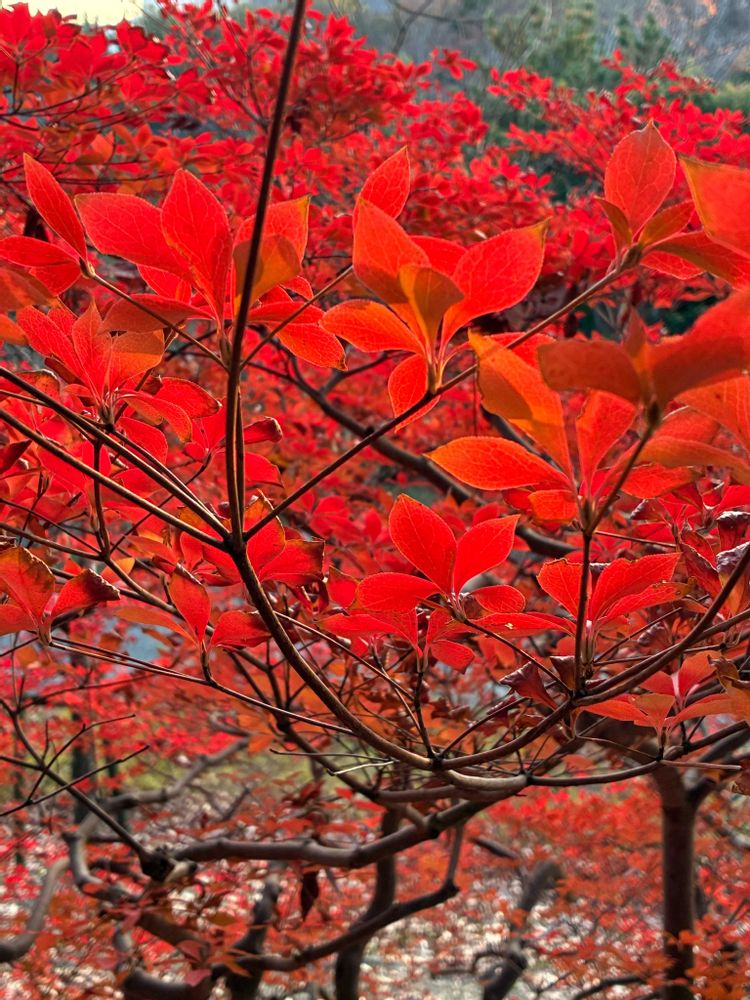 万博公園の日本庭園にて、夕暮れの「ドウダンツツジ」をパチリ!真っ赤になりました。📸♥️🤗😄🌇✌️
